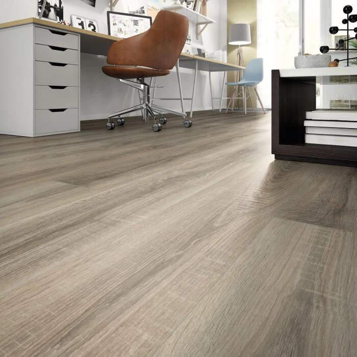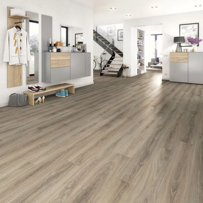 Smukt laminatgulv i grå nuancer og vintage-look.