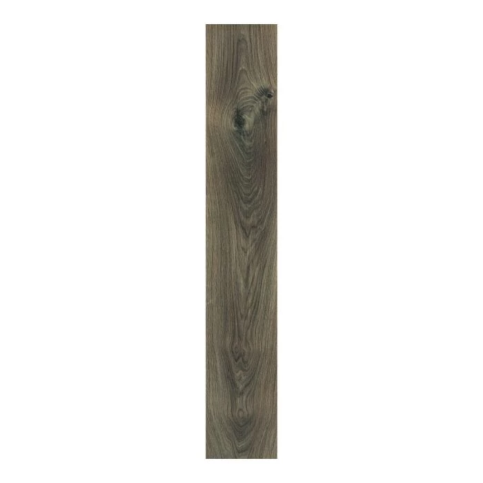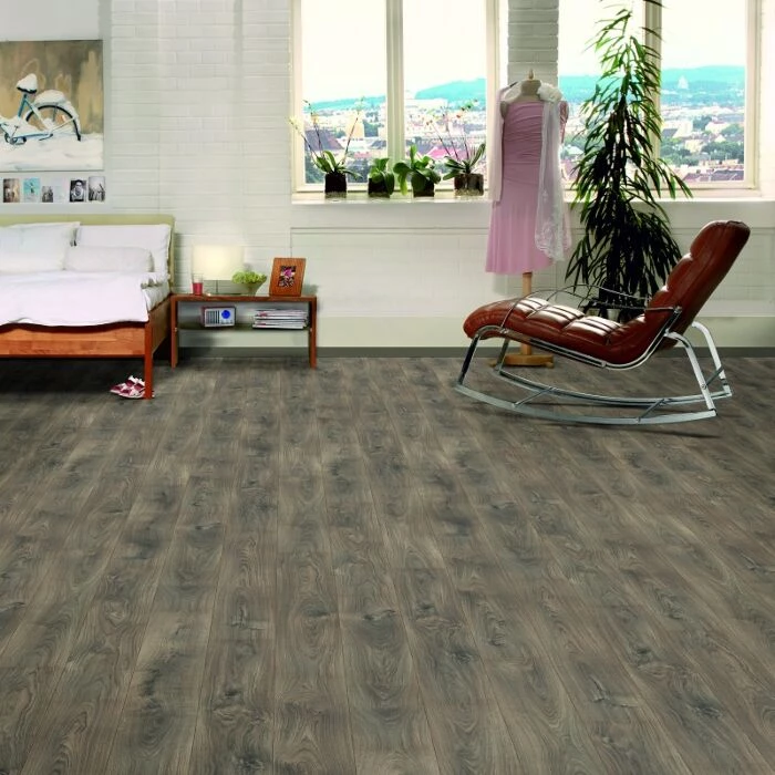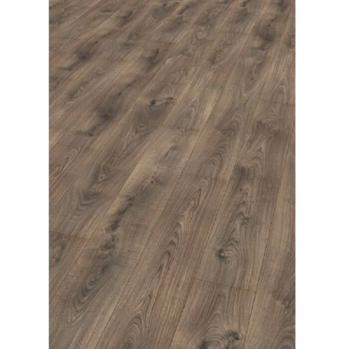 Laminatgulv med en flot overflade, der har et rustikt udtryk. Gulvet har fasede kanter, som får de enkelte planker til at træde frem. Den mørkebrune egetræsstruktur har et flot farvespil, der giver rummet kant og dynamik.