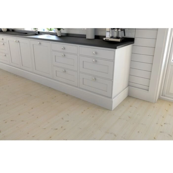 Denne pakke indeholder 18 m² slidstærkt fyrretræsgulv, hvis lyse farve matcher den skandinaviske stil perfekt.