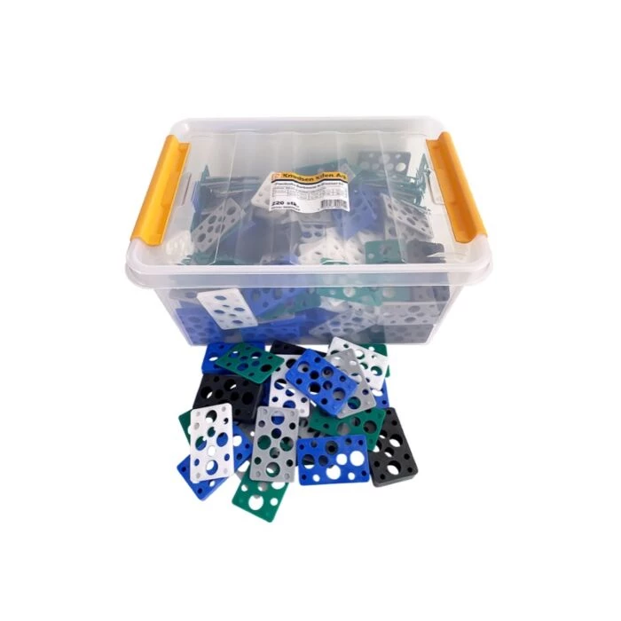 Hårdfør plastkasse med 220 stk. K-Klodser i forskellige størrelser og farver.