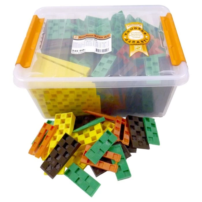 Kasse med 245 assorterede kiler i flere farver. Kilerne er lette at arbejde med og er meget robuste. De forskudte savtakker sikrer en nøjagtig og skridsikker opklodsning også sideværts.
