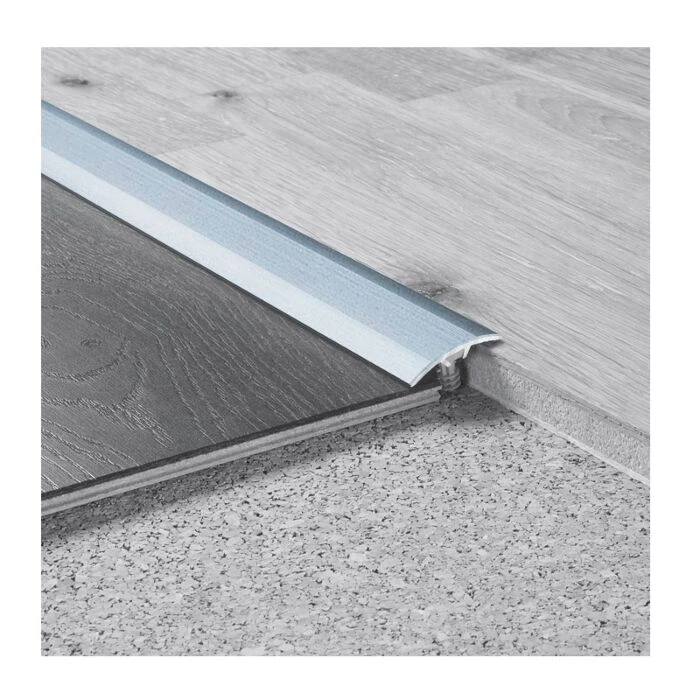 Skab en smuk overgang mellem to gulvtyper med denne overgangsprofil i sølvfarvet aluminium med skjult montering.