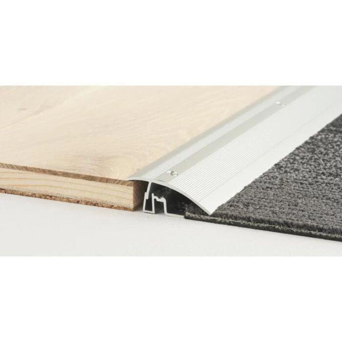 Med denne tilpasningsskinne i aluminium med sølvfarvet overflade kan du skabe en fin overgang mellem to gulve med forskellig højde.
