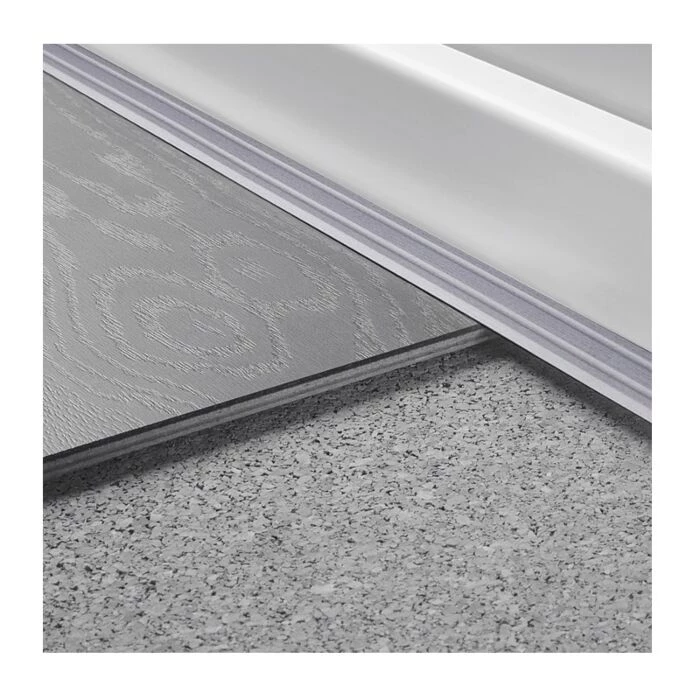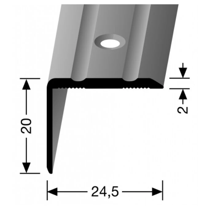 Denne vinkelprofil i aluminium med overflade i rustfrit stål kan bruges til at lave en fin afslutning og til kantbestykkelse af trappetrin og andre gulvkanter.