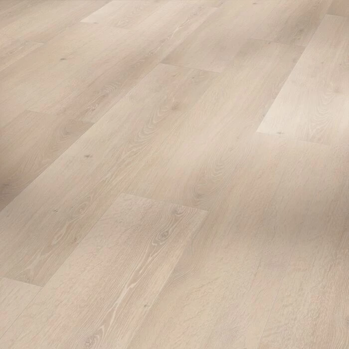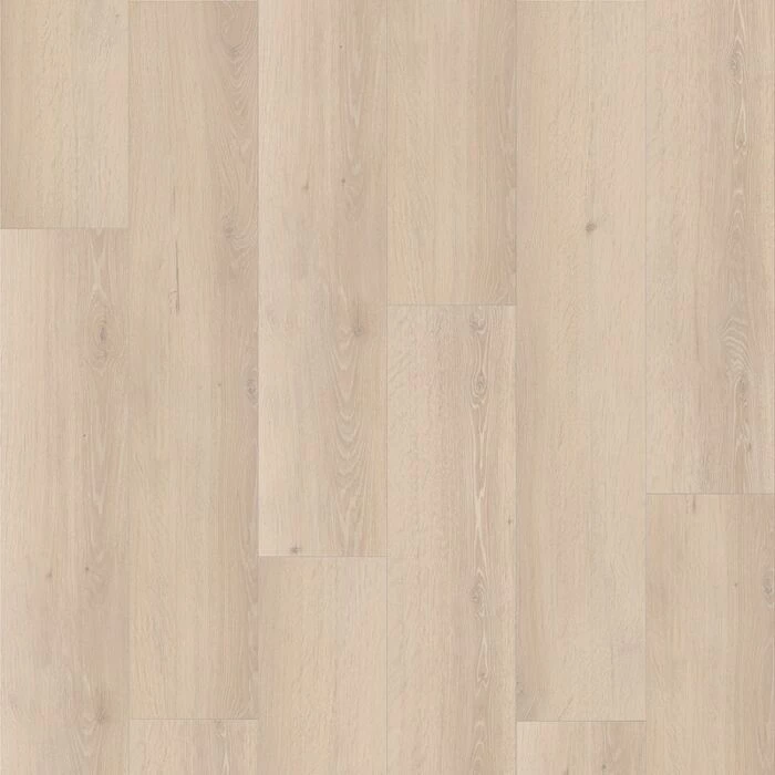 Elegant vinylgulv med et flot egetræslook og et lyst, hvidt farvespil, der passer til både moderne og traditionelt interiør.