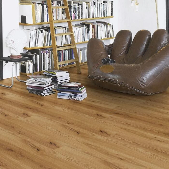 Klassisk egetræsgulv med et elegant farvespil, der passer til både moderne og traditionelt interiør. Overfladen er uden synlige samlinger, hvilket skaber et harmonisk udseende og gør gulvet nemt at rengøre.