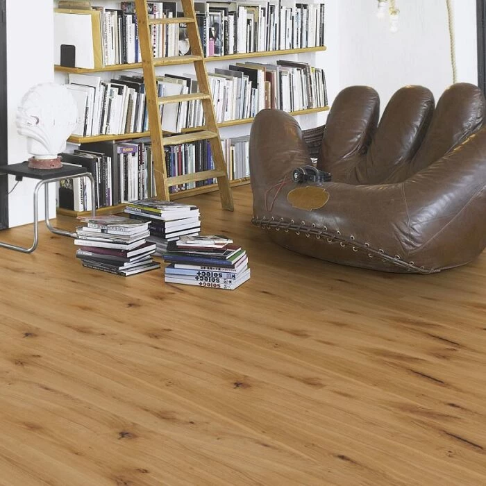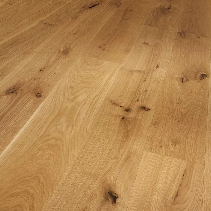 Klassisk egetræsgulv med et elegant farvespil, der passer til både moderne og traditionelt interiør. Overfladen er uden synlige samlinger, hvilket skaber et harmonisk udseende og gør gulvet nemt at rengøre.