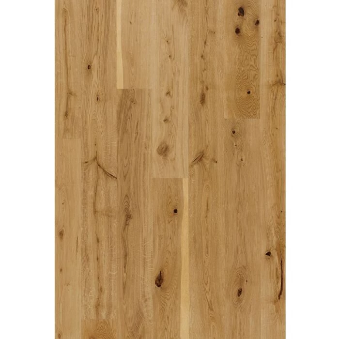 Klassisk lamelparket i lyst eg med mørkere åretegninger og knaster. Det lyse træ passer til både moderne og traditionelle indretninger.