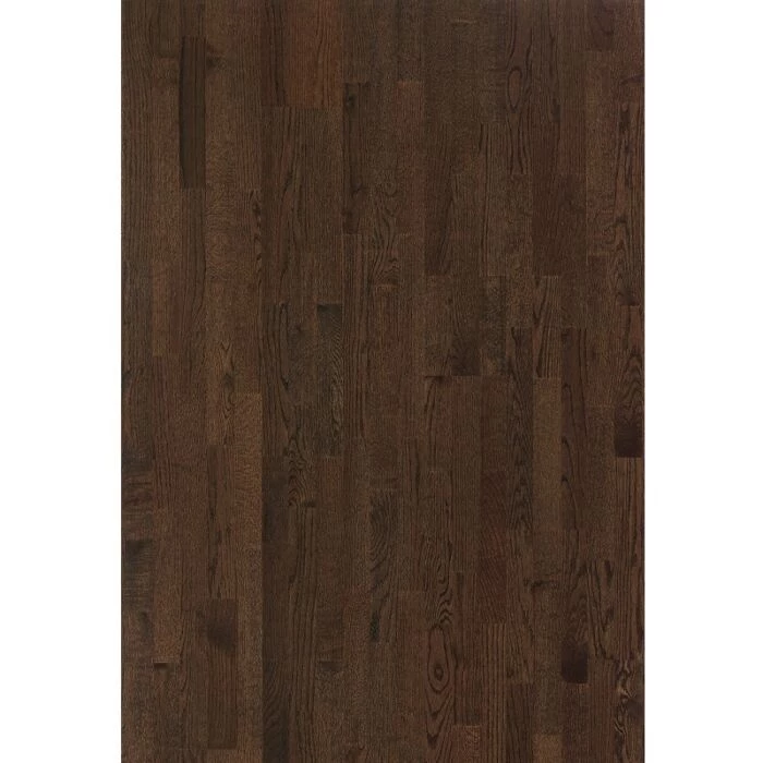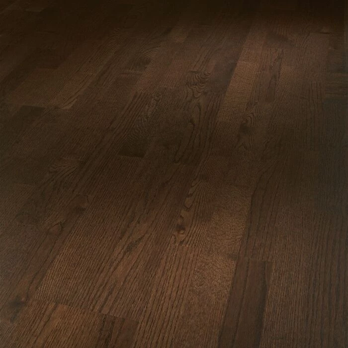 Klassisk 3-stavs lamelparket i smukt, mørkebrunt egetræ med mørkere åretegninger. Det mørke udtryk passer til både moderne og klassiske indretninger.