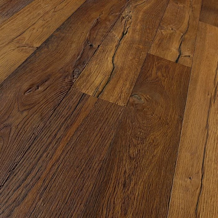 Overfladen er med omkørende fas, som fremhæver hver enkelt planke og giver et mønster med samme charme og elegance som et ægte træplankegulv. Et 4,00 mm slidlag af meget hårdt træ sikrer, at gulvet vil holde sig nyt og pænt i mange år.