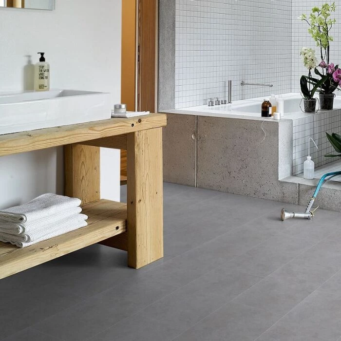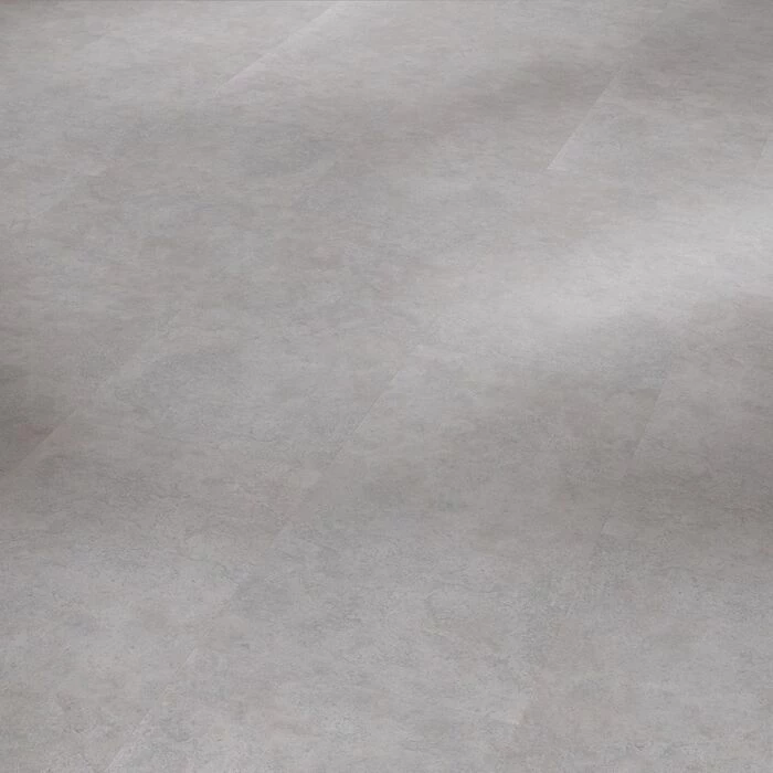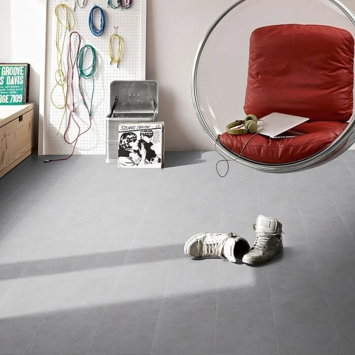 Elegant vinylgulv med fliselook og en betongrå overflade, der passer til både moderne og traditionelt interiør. Overfladen er uden samlinger, hvilket skaber et harmonisk udseende og gør gulvet nemt at holde rent.
