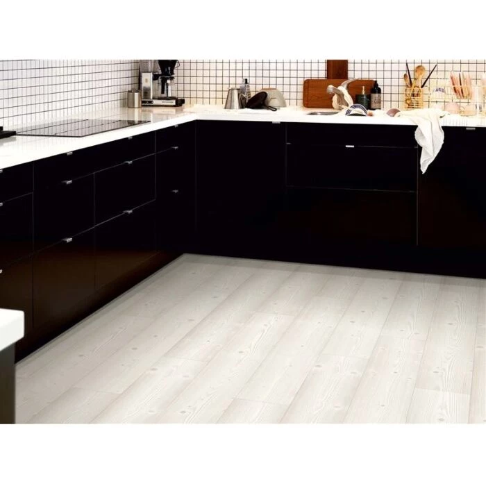 Børstet, hvid fyr overfladen har et lyst trælook med tydelige knaster og åretegninger. Det er en del af Pergos Sensation kollektion med Genuine™ rustic struktur og ekstramat finish, som er med dybe prægninger, der fremhæver knaster, revner og årer, man kender fra naturligt trægulv.
