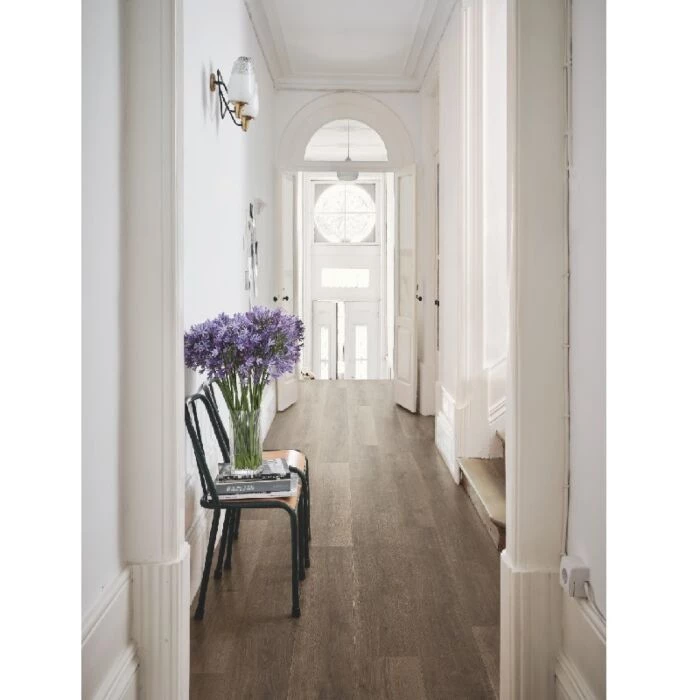 Laminatgulvet Pure Brown Oak fra Pergo er et slidstærkt og vandafvisende gulv med en tykkelse på 9 mm.