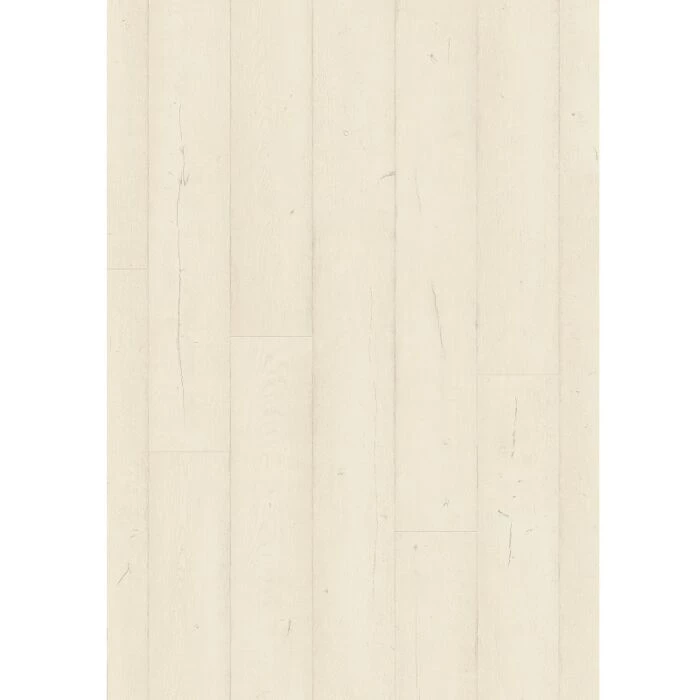 Giv dit hjem et minimalistisk udtryk med dette hvide egetræsgulv med uregelmæssige mellemrum, ufuldkomne facetter og realistiske revner og porer, som stadig er synlige gennem glansfuld hvid lak.