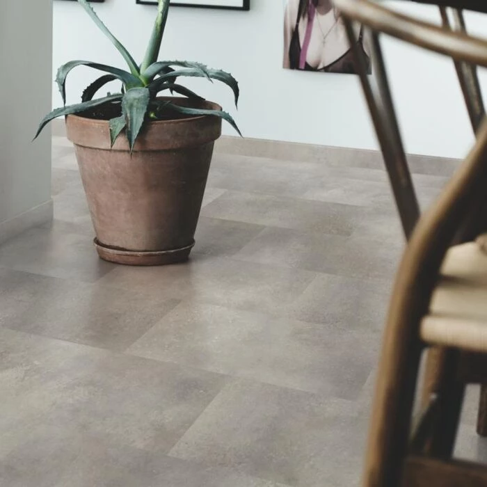 Vinylgulvet skaber en hyggelig atmosfære med et strejf af luksus. Gulvet har en flot, realistisk stenstruktur, der ligner et ægte stengulv. Den grå stenstruktur ser autentisk ud, men du slipper for den kølige fornemmelse, et ægte stengulv ville afgive.