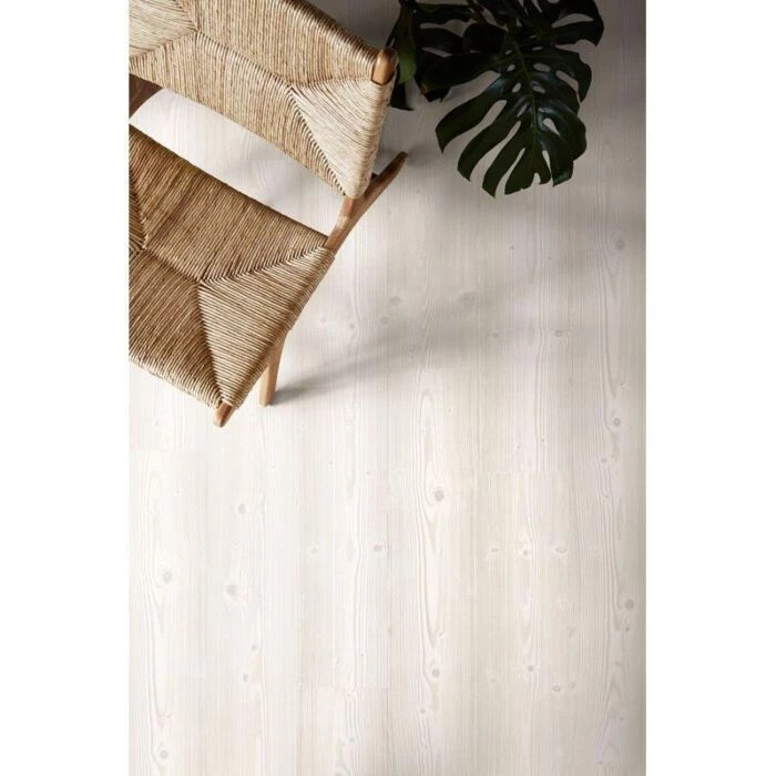 Smukt og lyst vinylgulv med en mat hvid overflade.