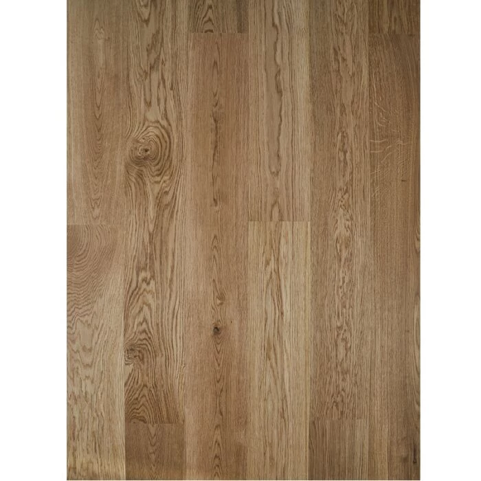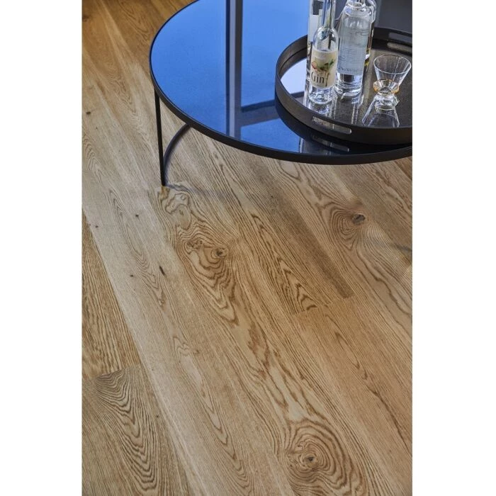 Slotsplank Eg Accent Natur med lyse og mørke nuancer og en del knaster. Plankerne har en smuk, børstet overflade, som er med til at fremhæve træets åretegninger og passer perfekt ind i det naturlige og nordiske hjem.
