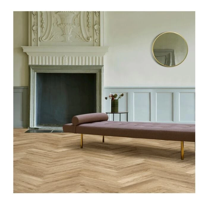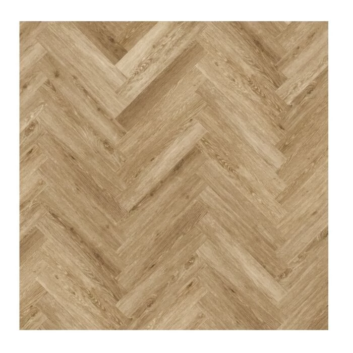 Flot vinylplank i mørke, gyldne nuancer. Gulvet har en naturtro overflade i 3D og kommer i stave af 10 cm i bredden og 60 cm i længden – gulvet skal monteres i klassisk sildeben.
